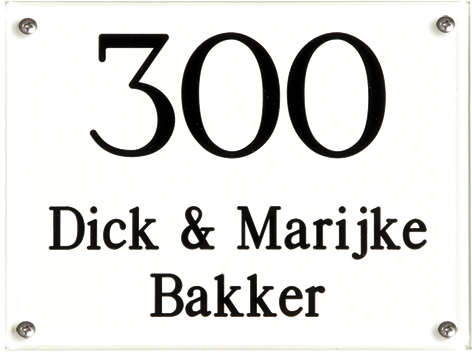Glaslook is geen glas (glas is uiteraard erg breekbaar), maar een luxe en tegelijk stevige kunststofsoort (8 mm dikte) met de uitstraling van glas. Het materiaal is dan ook volledig doorzichtig en verkrijgbaar in verschillende kleurvarianten. Glaslook is uitstekend geschikt voor gebruik in en rondom uw woning. De tekst wordt in alle glaslook-naamborden gegraveerd, waardoor uw naam niet weg kan slijten of vervagen. Het bijzondere aan glaslook is dat het aan de achterzijde ingegraveerd wordt, dit in tegenstelling tot andere kunststofsoorten. Hierdoor blijft het materiaal aan de voorzijde glad en krijgt het een zeer luxe uitstraling. Tot slot: Glaslook wordt geleverd met afstandbusjes waardoor u het naambord eenvoudig op een korte afstand van de muur kunt monteren.