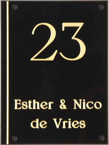 Perspex is een stevige kunststofsoort (3 mm dikte), welke uitstekend geschikt is voor gebruik in en rondom uw woning. De tekst wordt in alle perspex-naamborden gegraveerd, waardoor uw naam niet weg kan slijten of vervagen. De transparante perspex naamborden worden aan de achterzijde ingegraveerd (waardoor de voorkant glad blijft) en de gekleurde perspex naamborden worden aan de voorzijde ingegraveerd. Tot slot: de perspex-naamborden zijn standaard voorzien van schroefgaten (tenzij anders vermeld) en worden geleverd met afstandbusjes en afdekdopjes waardoor u het naambord eenvoudig op een korte afstand van de muur kunt monteren.